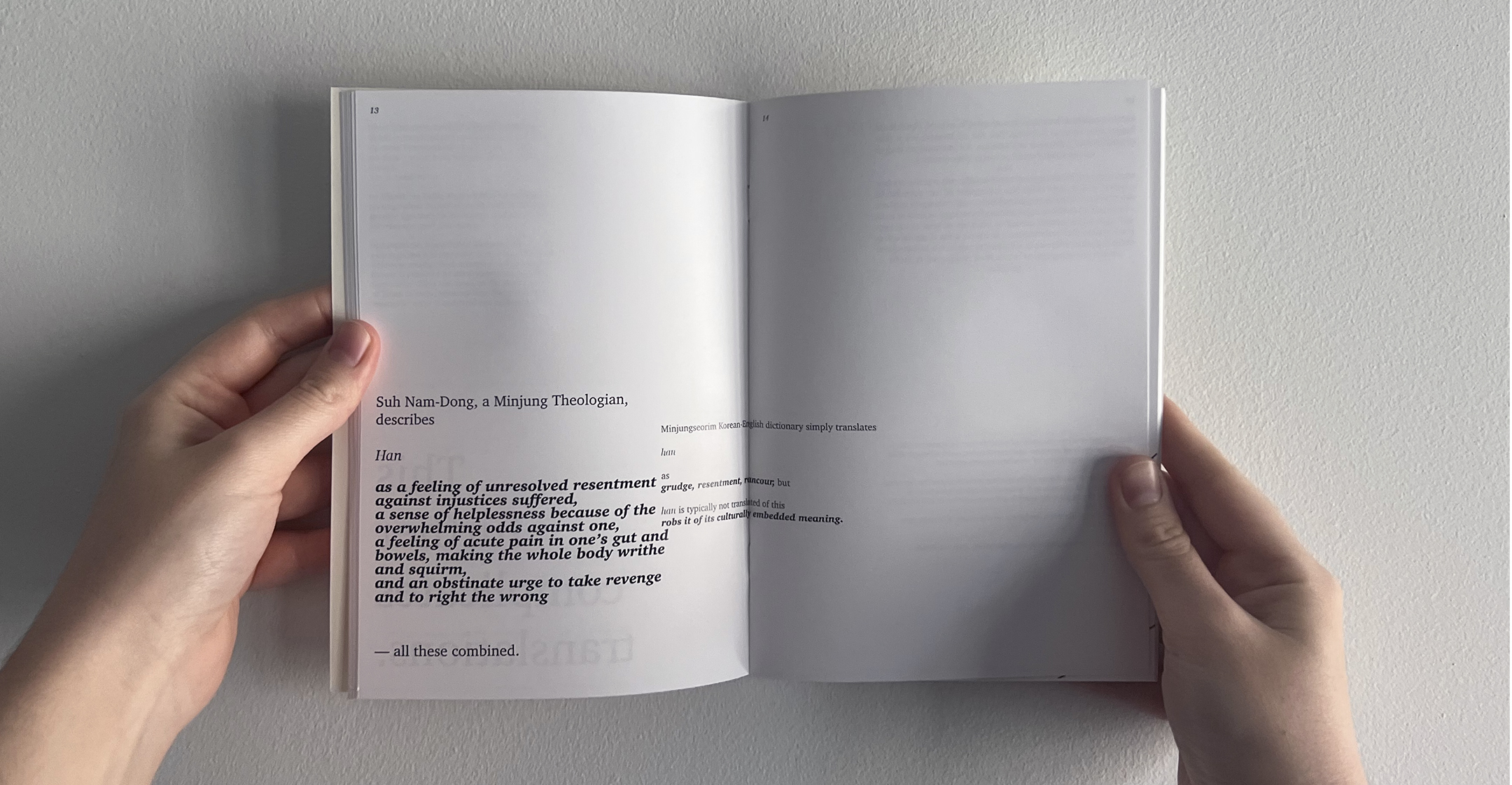 This small booklet lists the artist’s collection of found descriptions and definitions of the Korean affect han. The finds are predominantly from North American positionings.